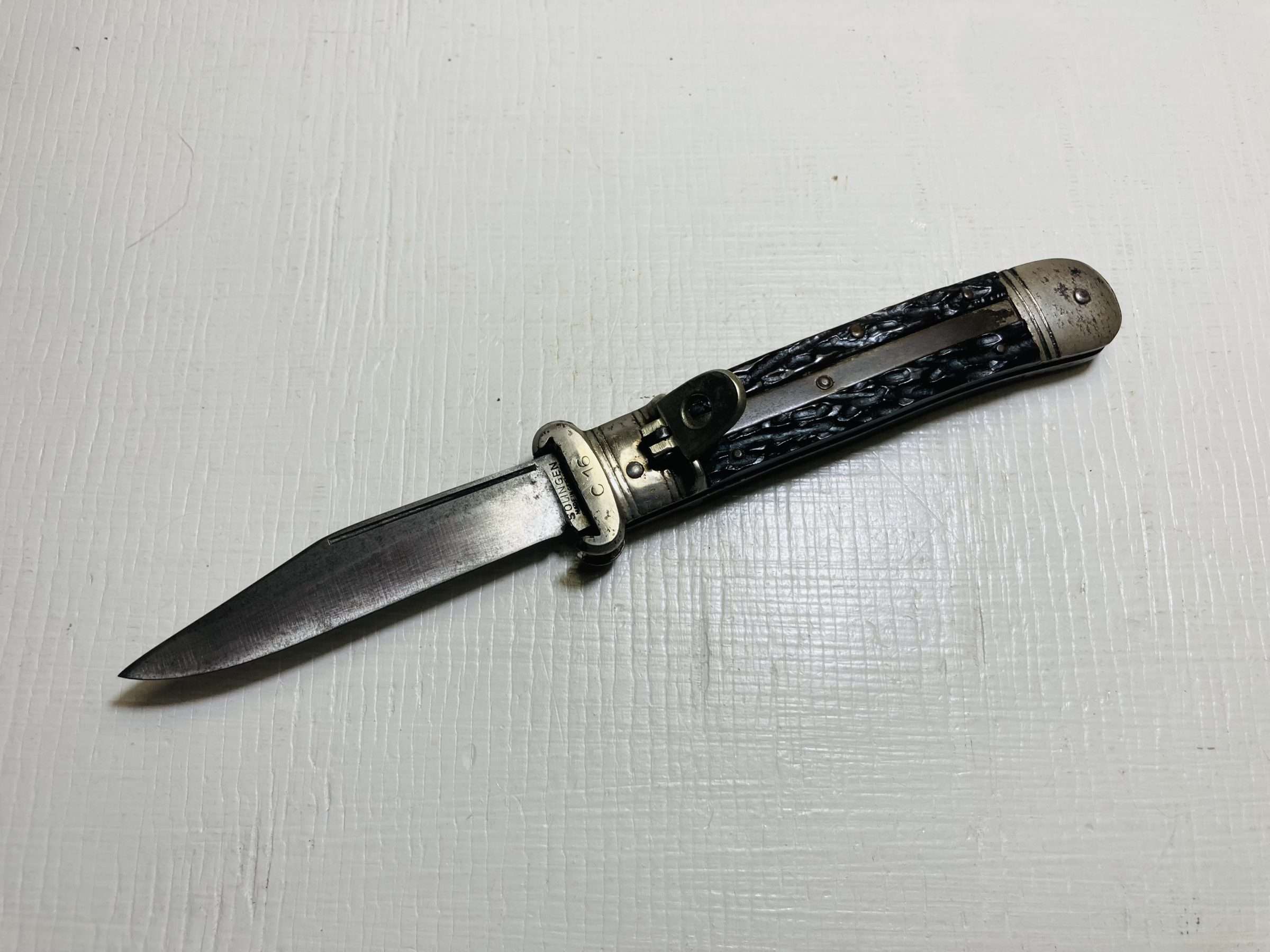 A desirable vintage automatic for collectors of European switchblades, hunting knives, or traditional Solingen lever locks.