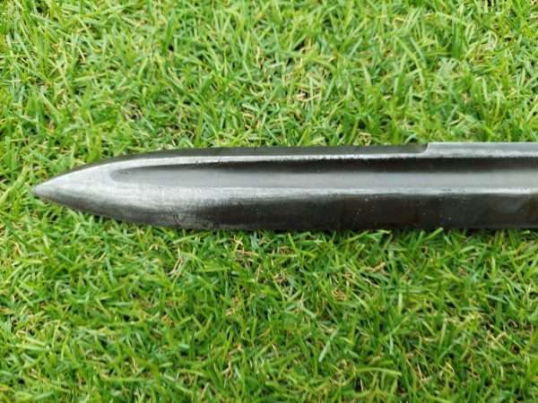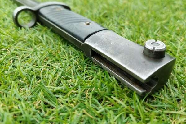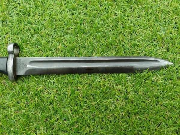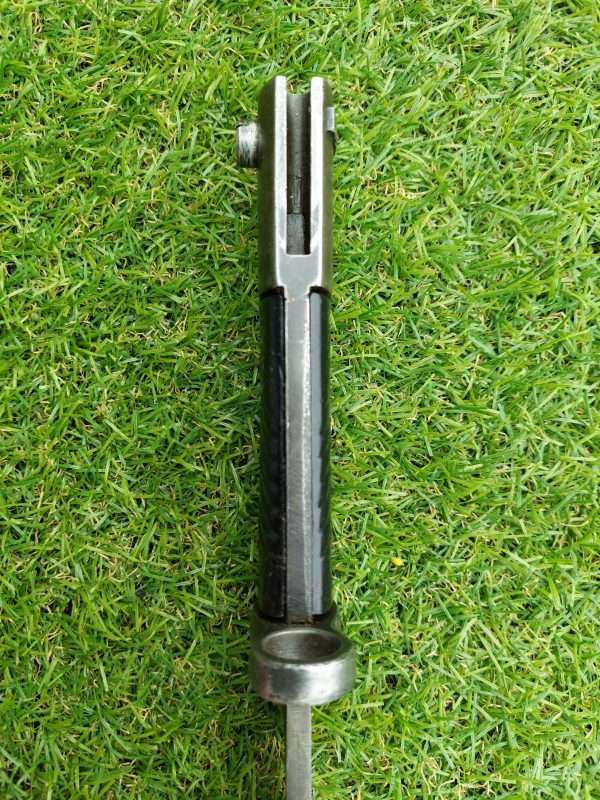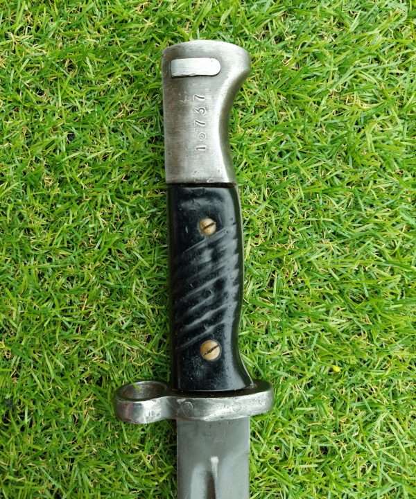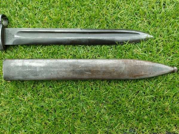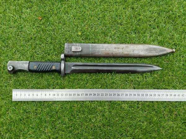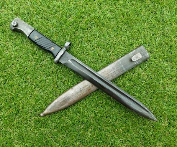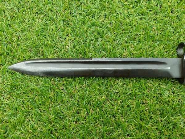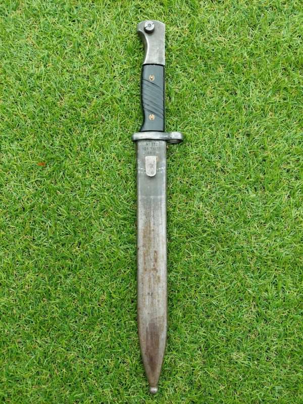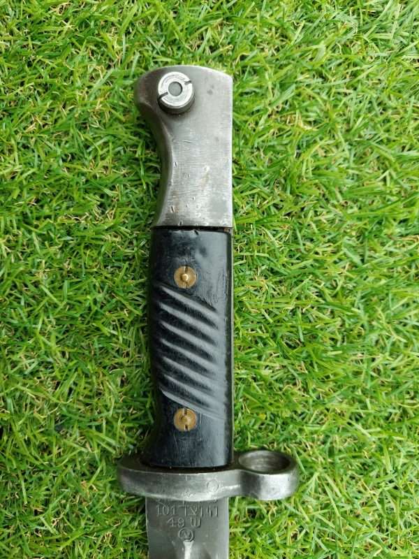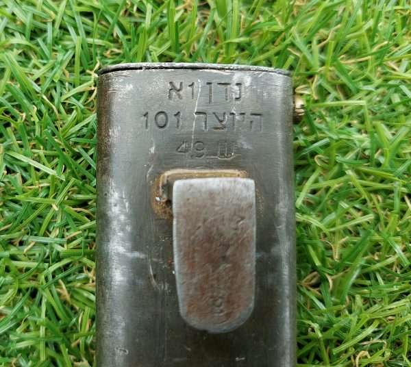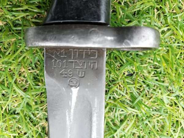 Sterile K98 bayonet purchased by the Israeli Army after WW2 to fit the Israeli K98 rifle which also was purchased by the Israeli Army from Germany after WW2. This example has a nice clean blued blade with the false edge which was placed on the bayonet by the Israeli’s. Correct markings to the blade and scabbard with a date mark of 49 (1949).