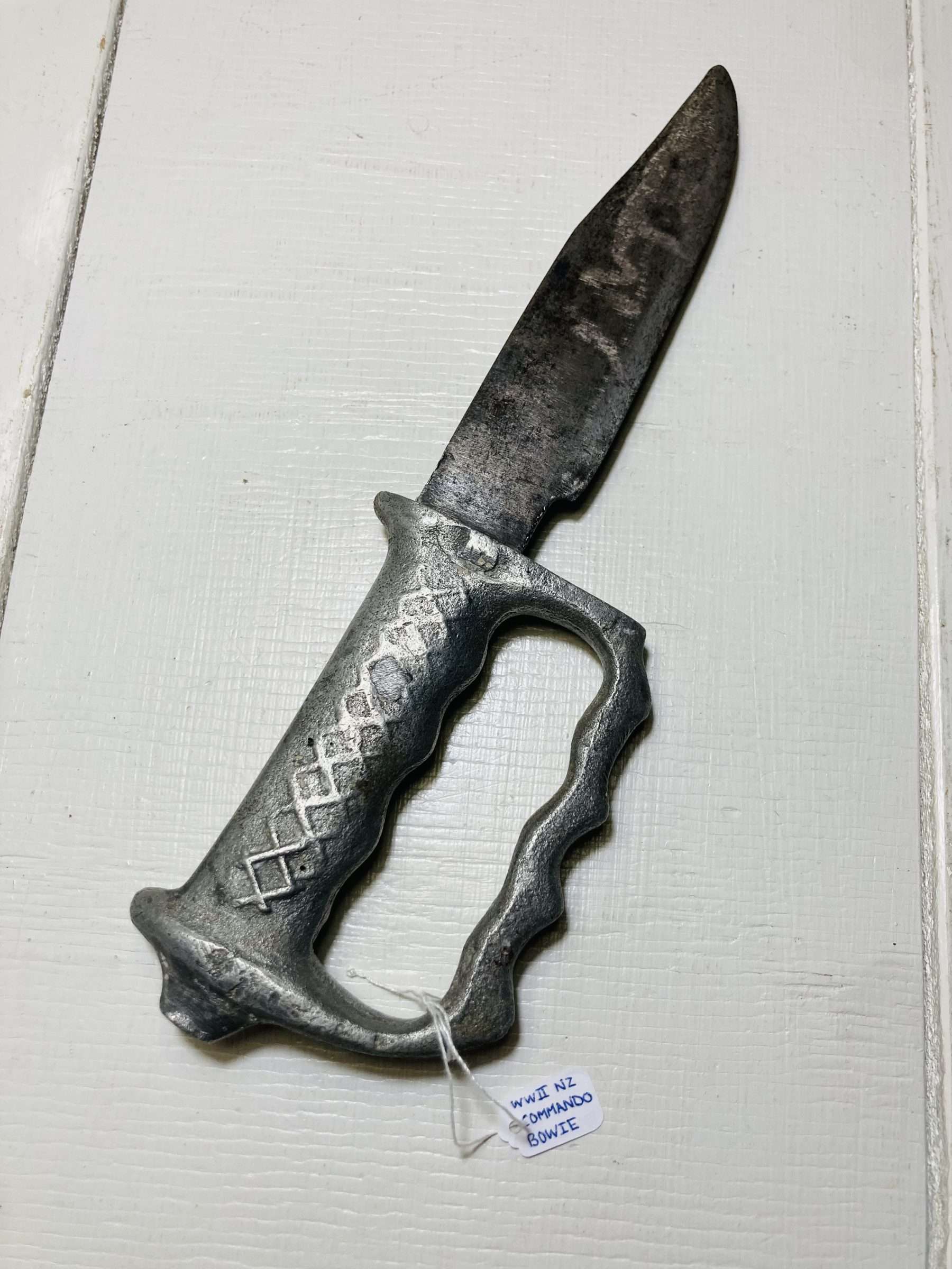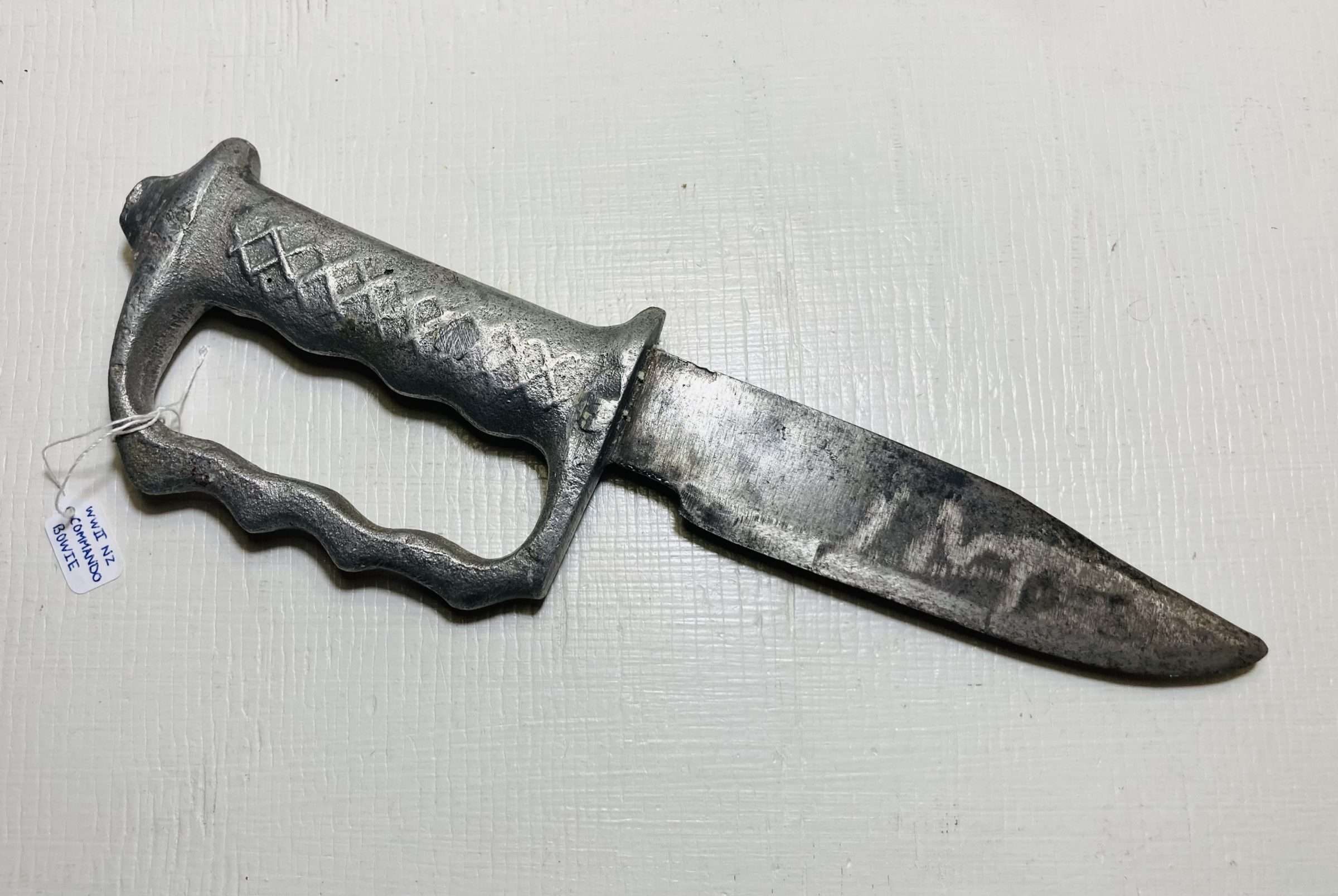 Privately purchased or locally produced fighting knives such as this were often carried by New Zealand servicemen during WWII, and surviving examples — particularly Bowie-bladed variants — are extremely scarce today. The combination of trench knife form with Bowie fighting blade makes this a highly desirable and unusual piece for collectors of Commonwealth militaria.