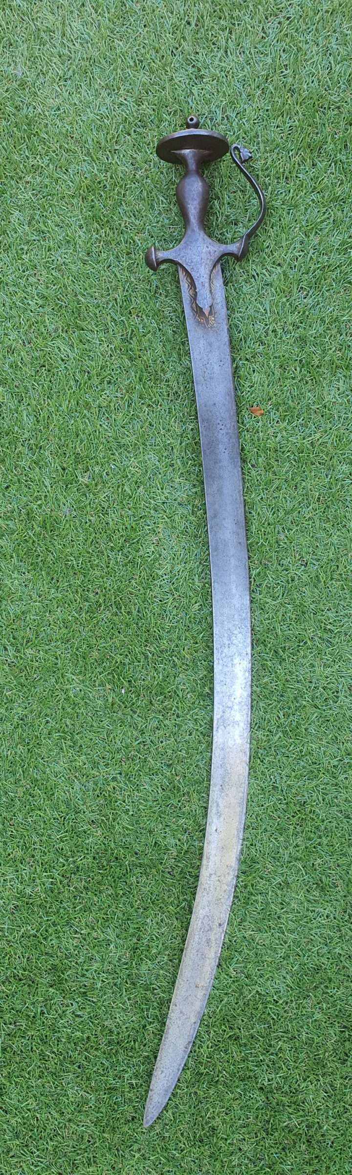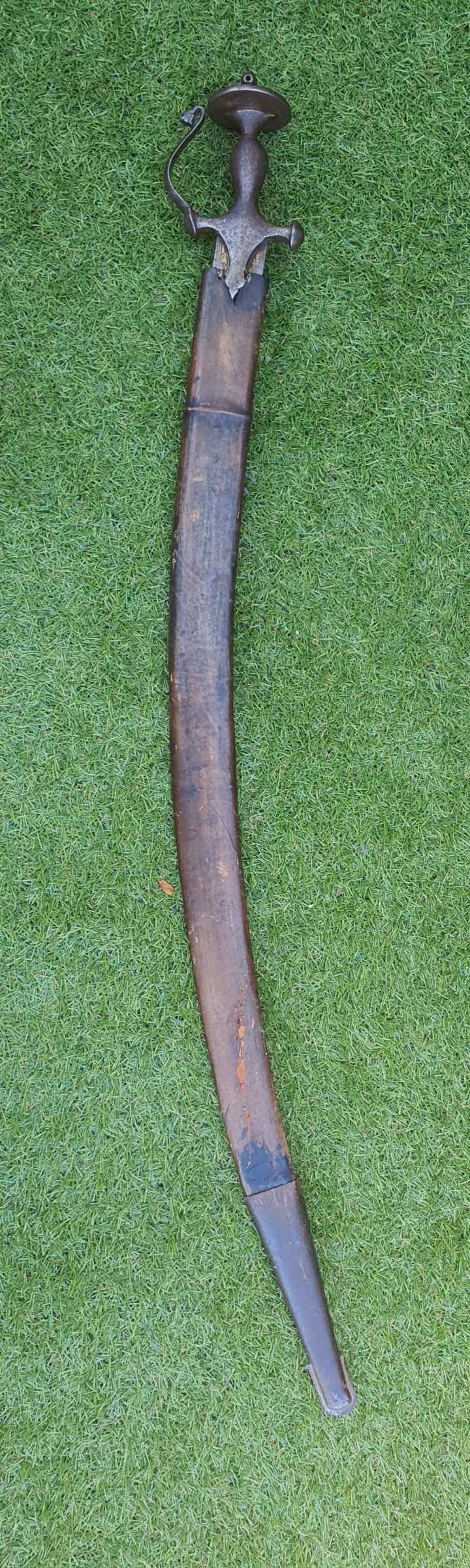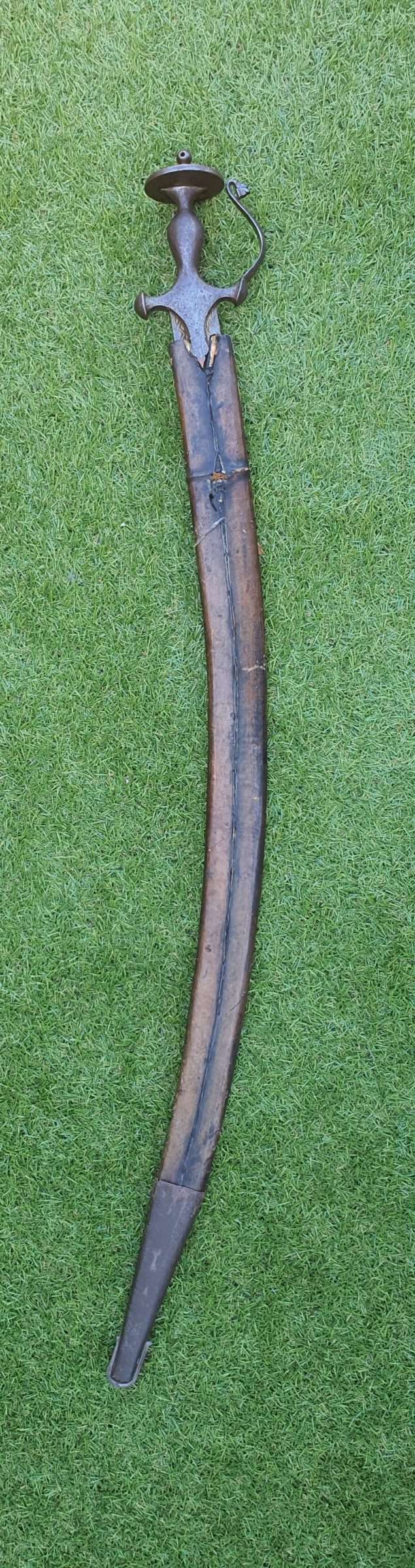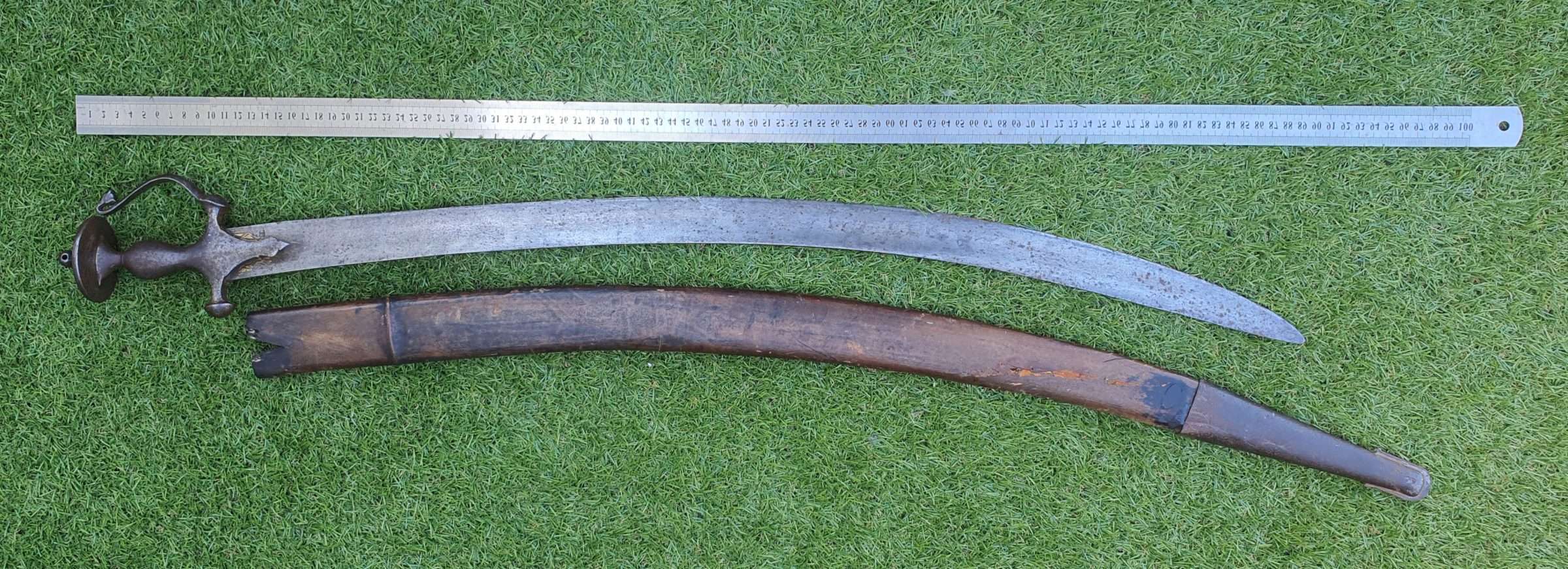 Indian Talwar Sword Or Sabre with Scabbard. Probably mid 18th Century with a typical iron disc hilt and knuckle bow, and a fullered blade. There as signs of gilding decoration on the hilt. These were used extensively within the Indian sub continent.