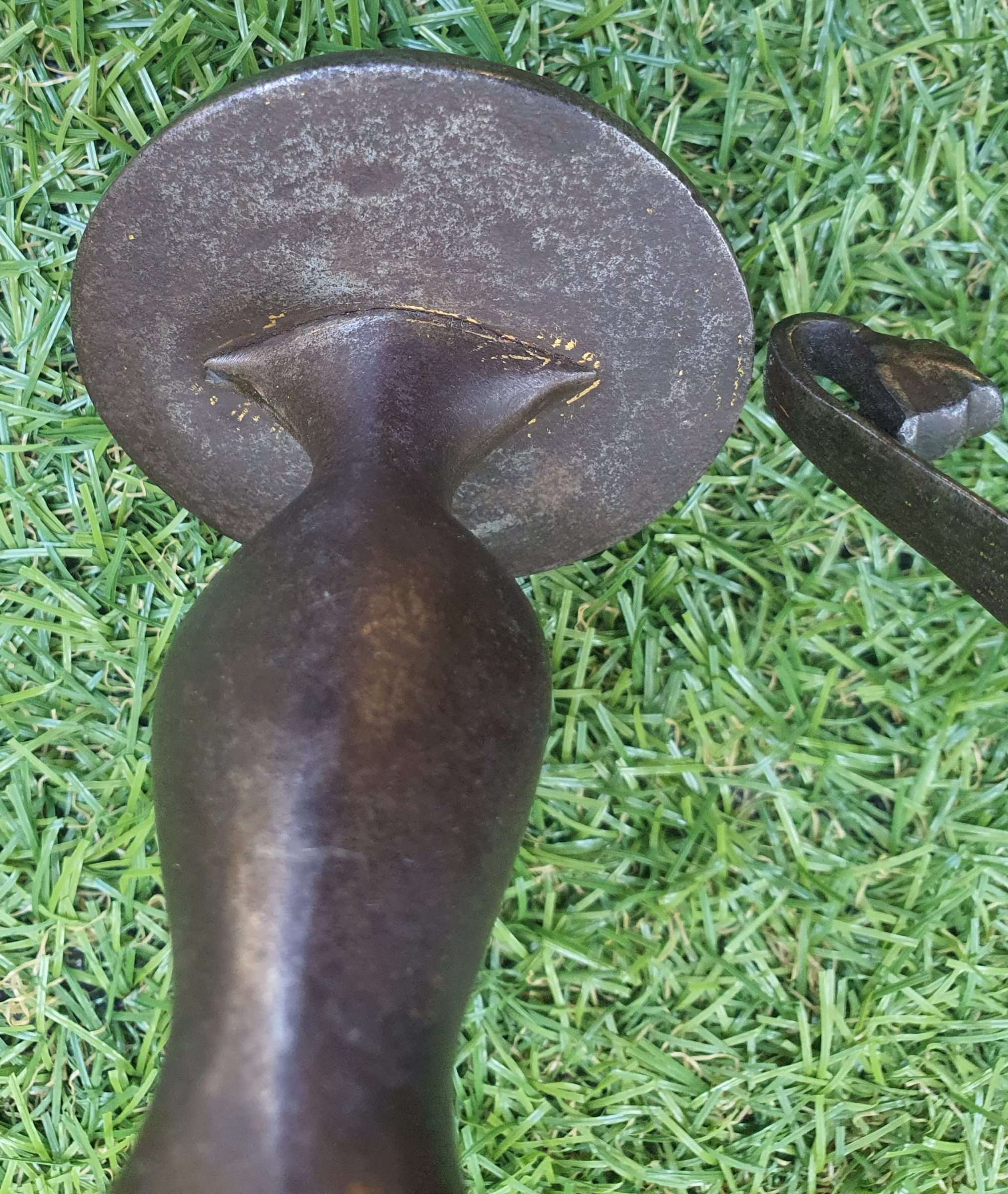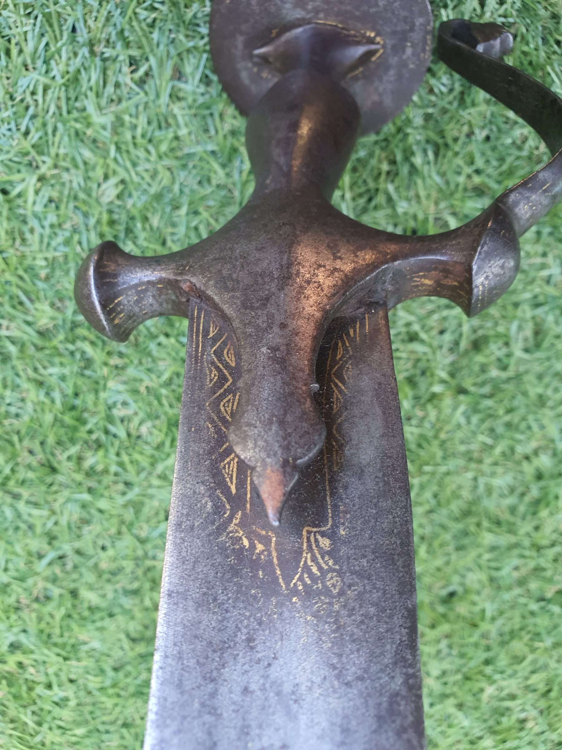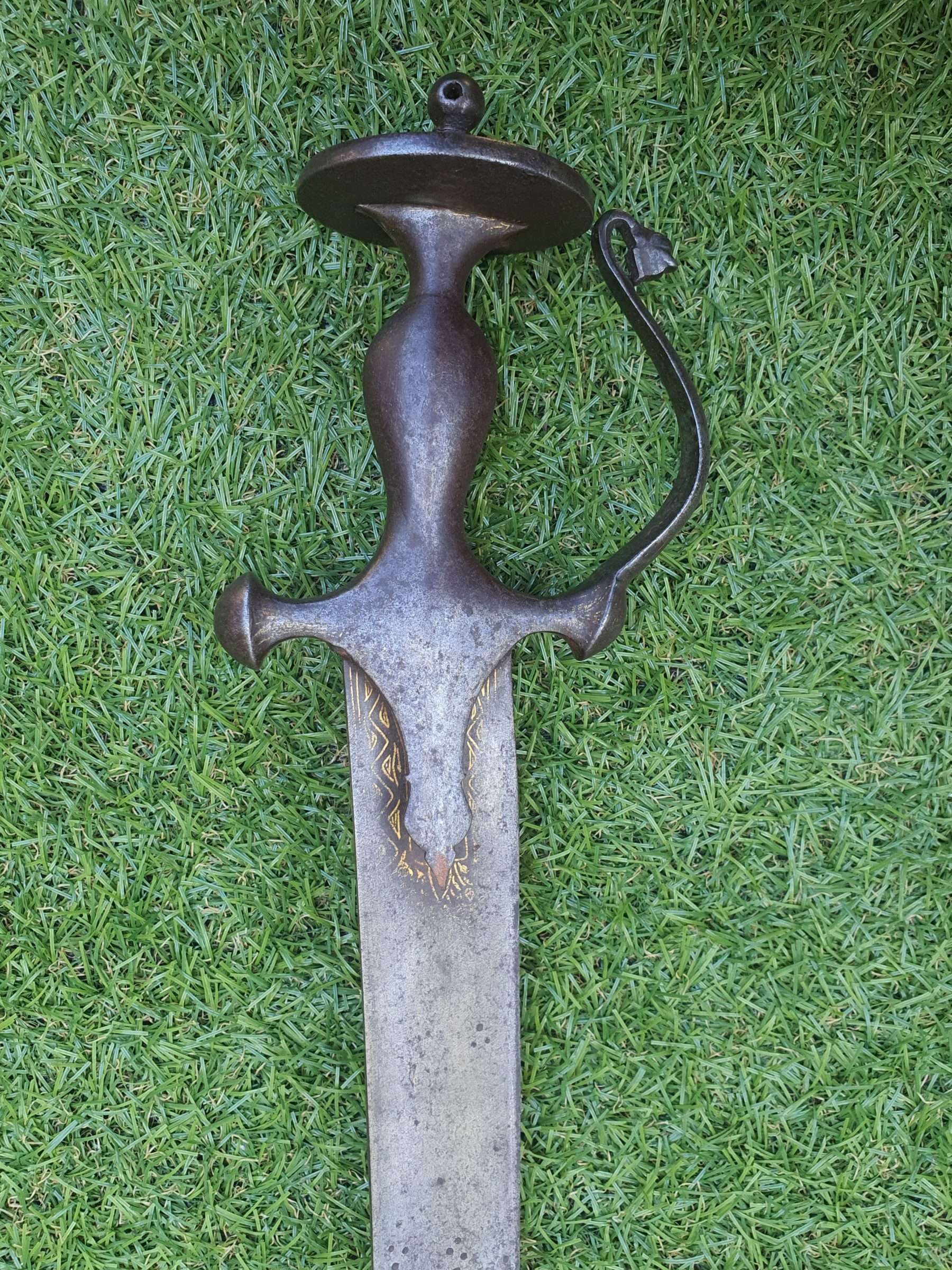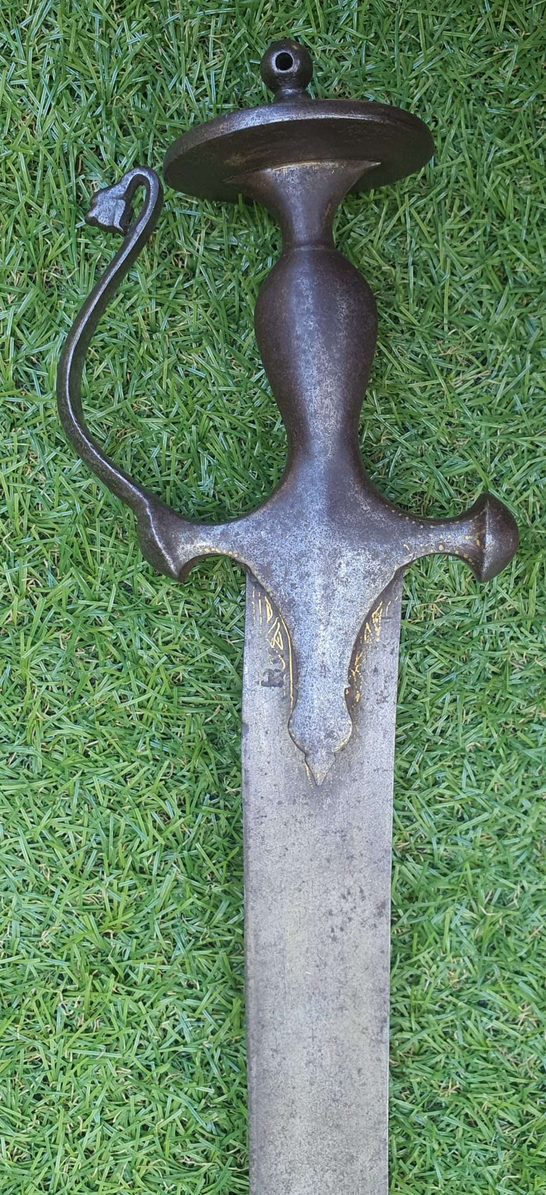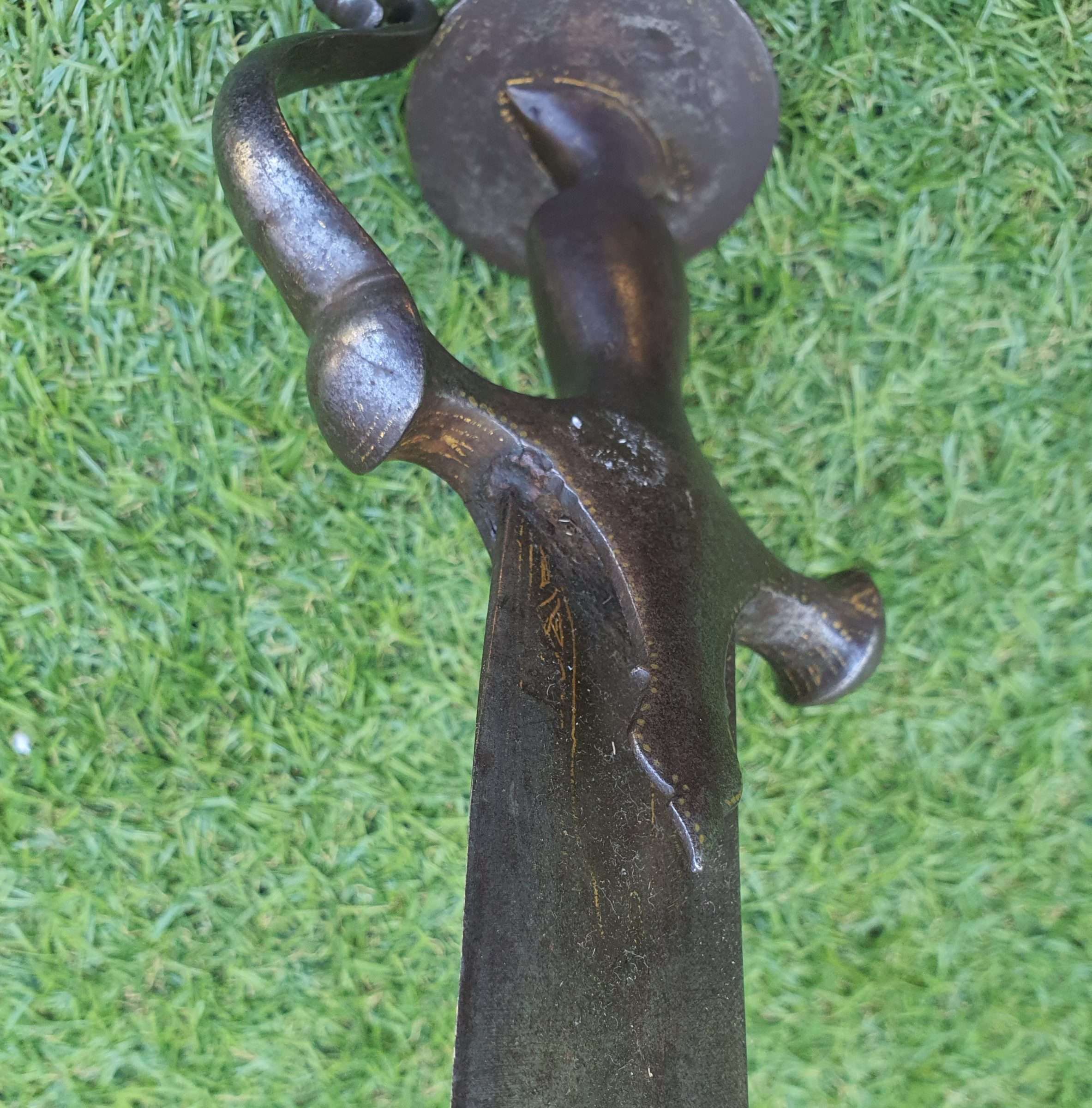 Indian Talwar Sword Or Sabre with Scabbard. Probably mid 18th Century with a typical iron disc hilt and knuckle bow, and a fullered blade. There as signs of gilding decoration on the hilt. These were used extensively within the Indian sub continent.