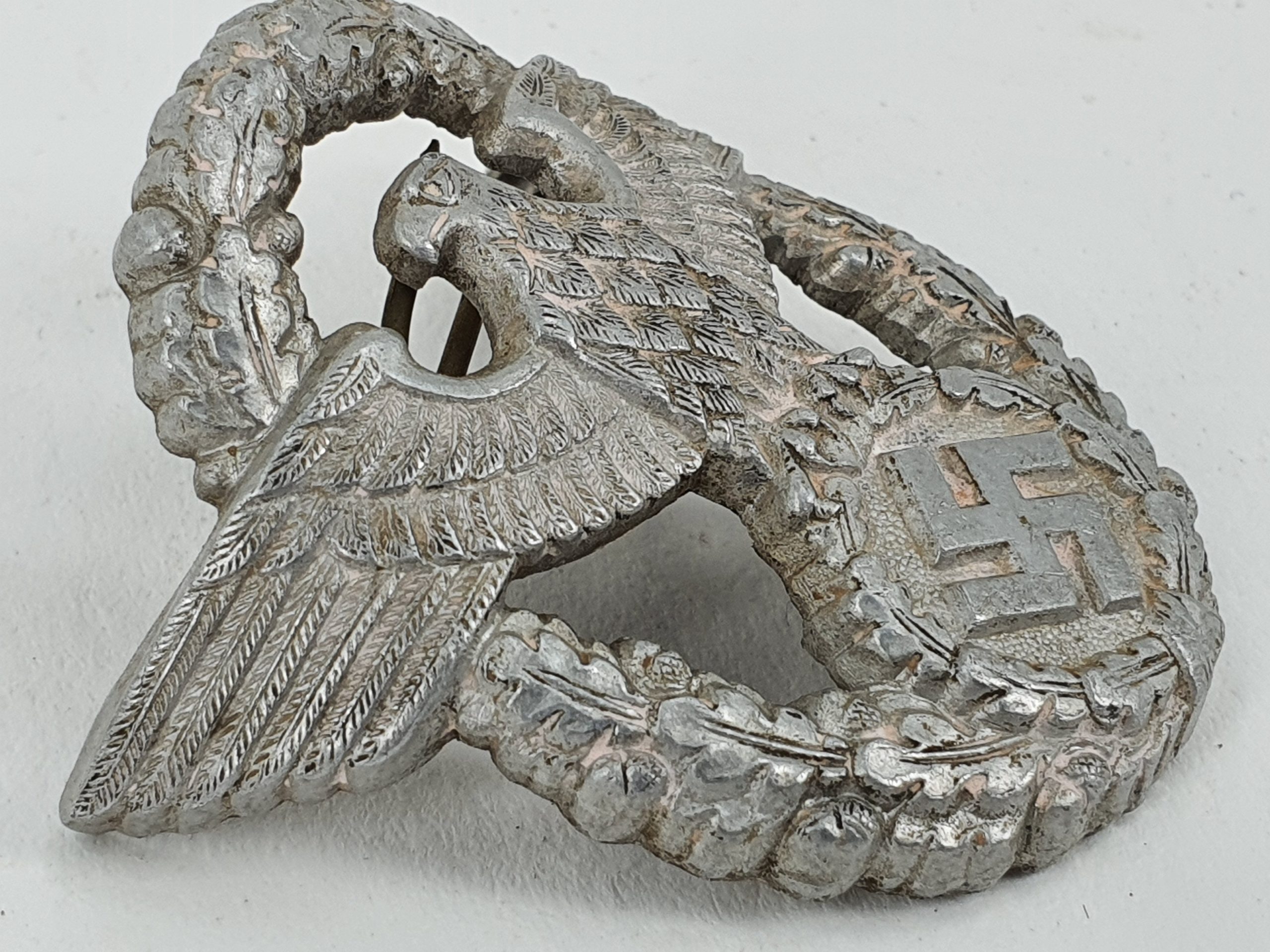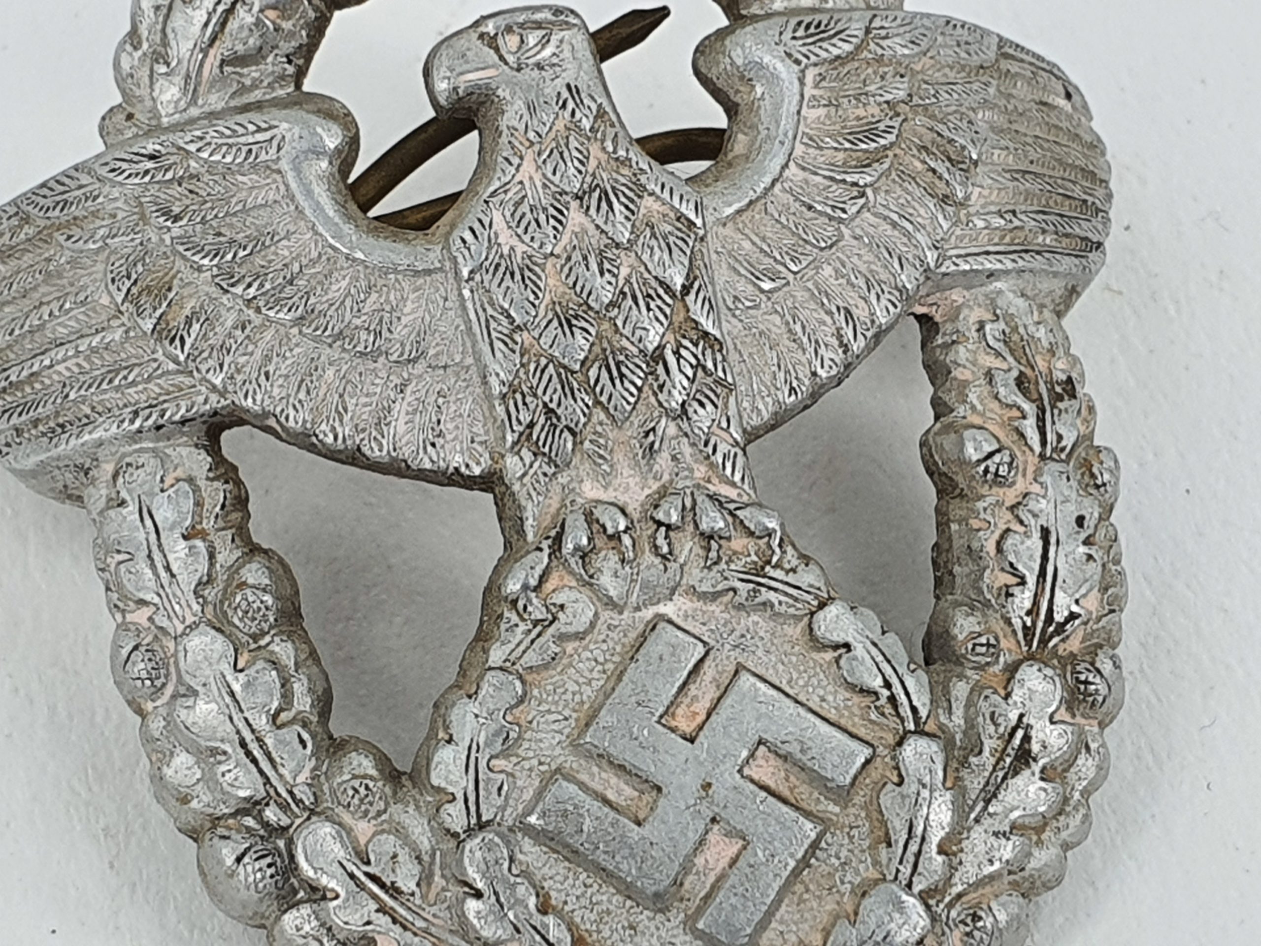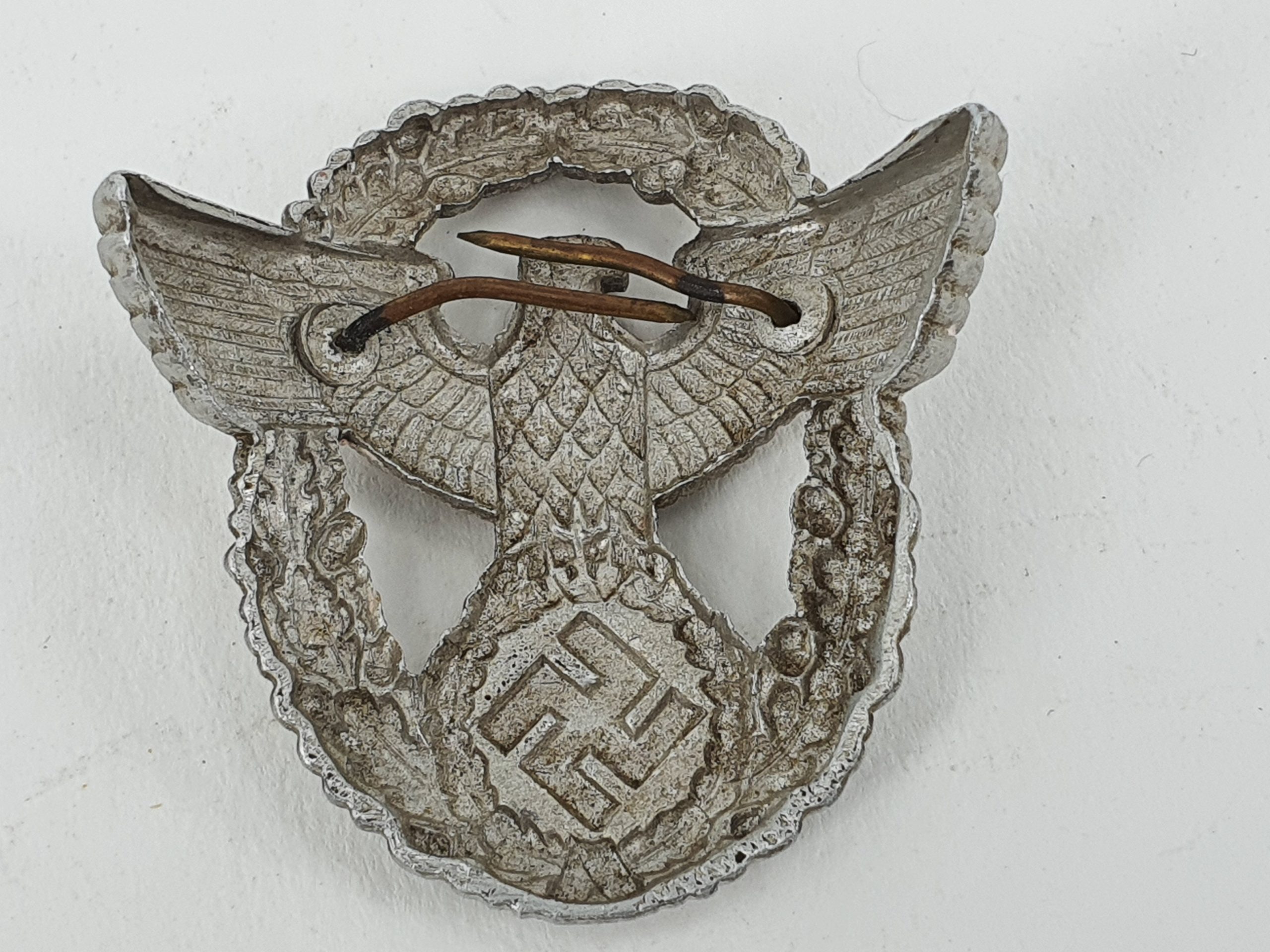 Original WW2 German Police enlisted mans visor cap/hat eagle with both pins as pictured.