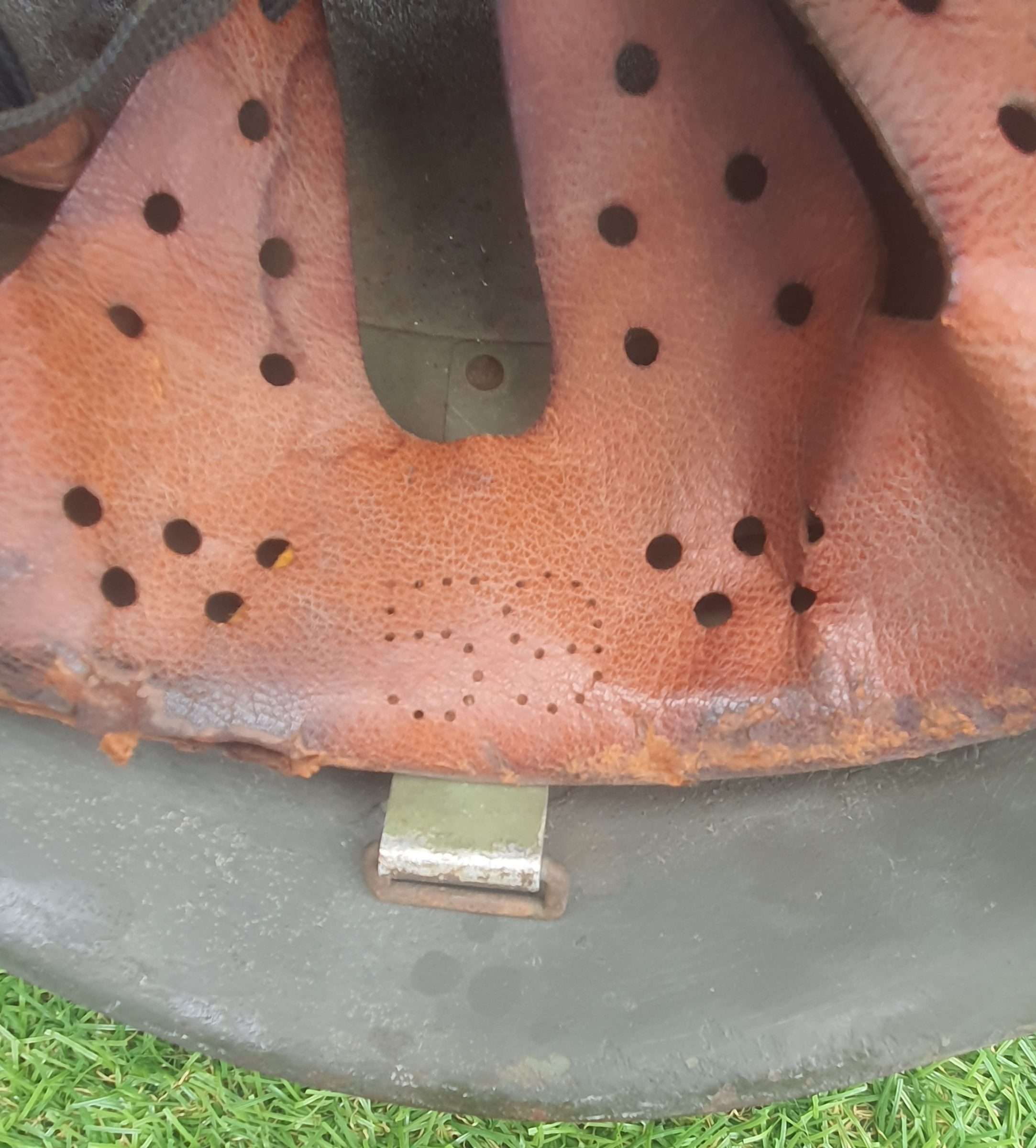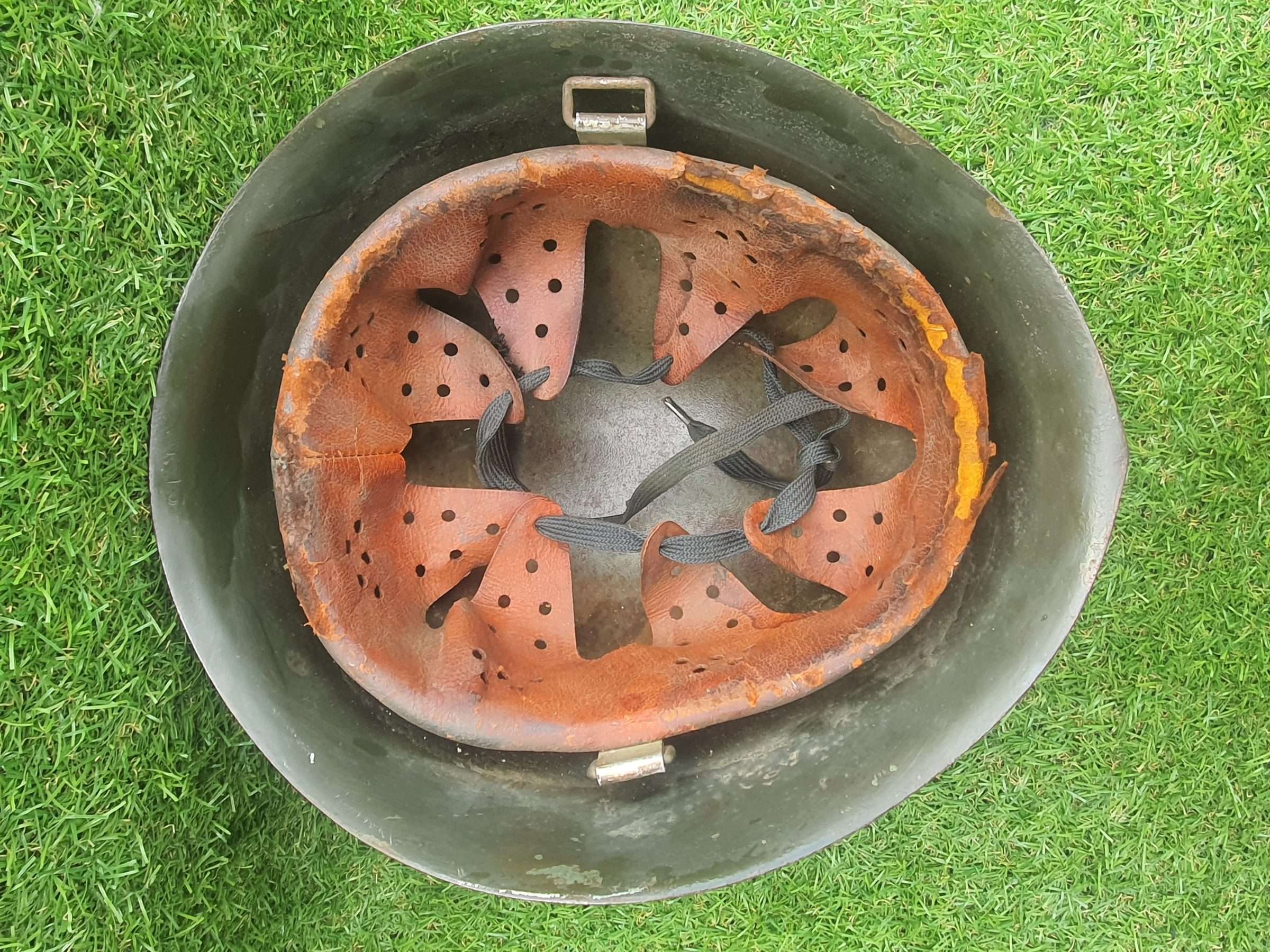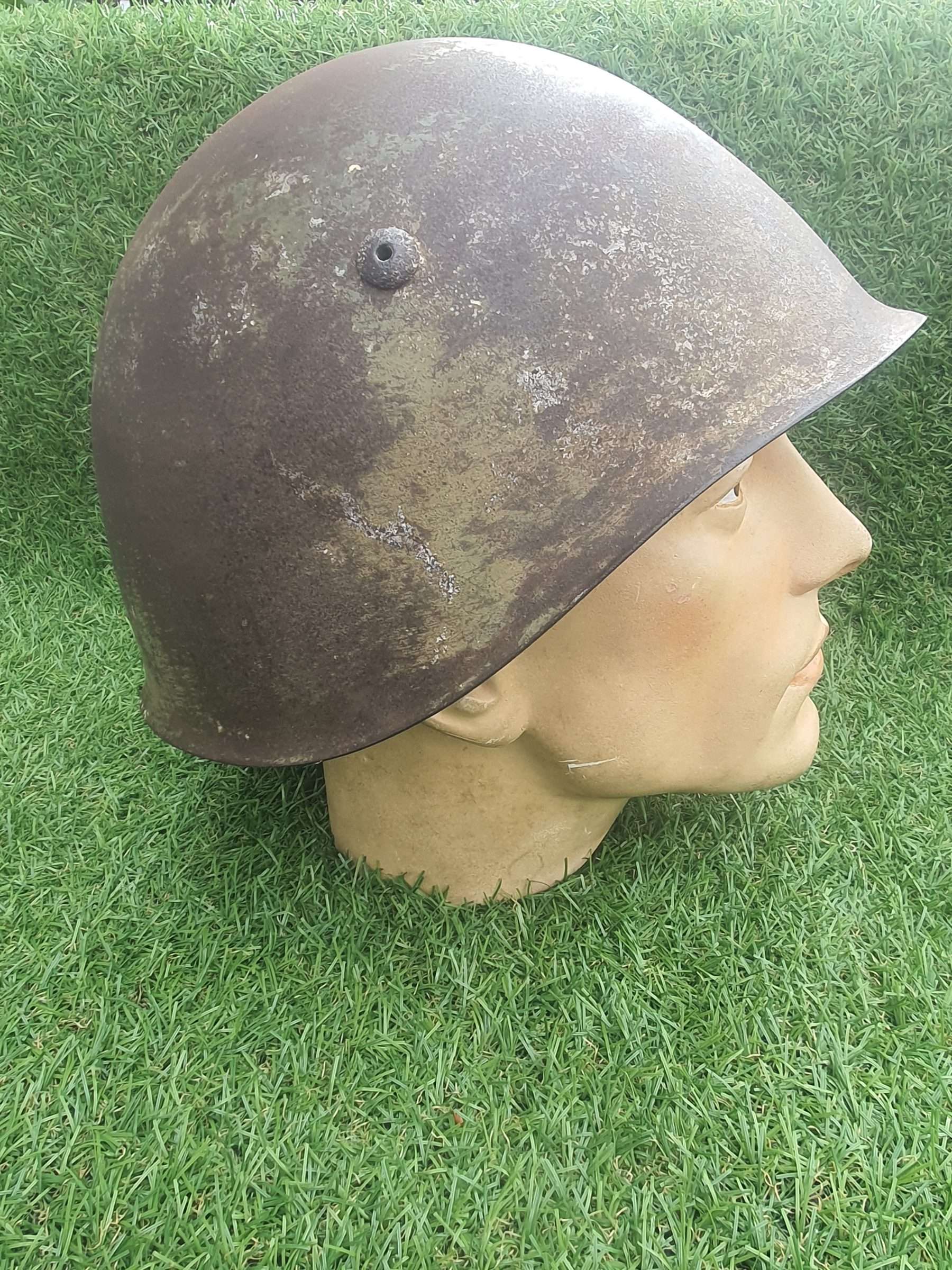 This is a WW2 Period helmet, and shows the original green paint of the Italian army on the outside shell, the inside has been resprayed but does have the original paint underneath. Not chin strap.