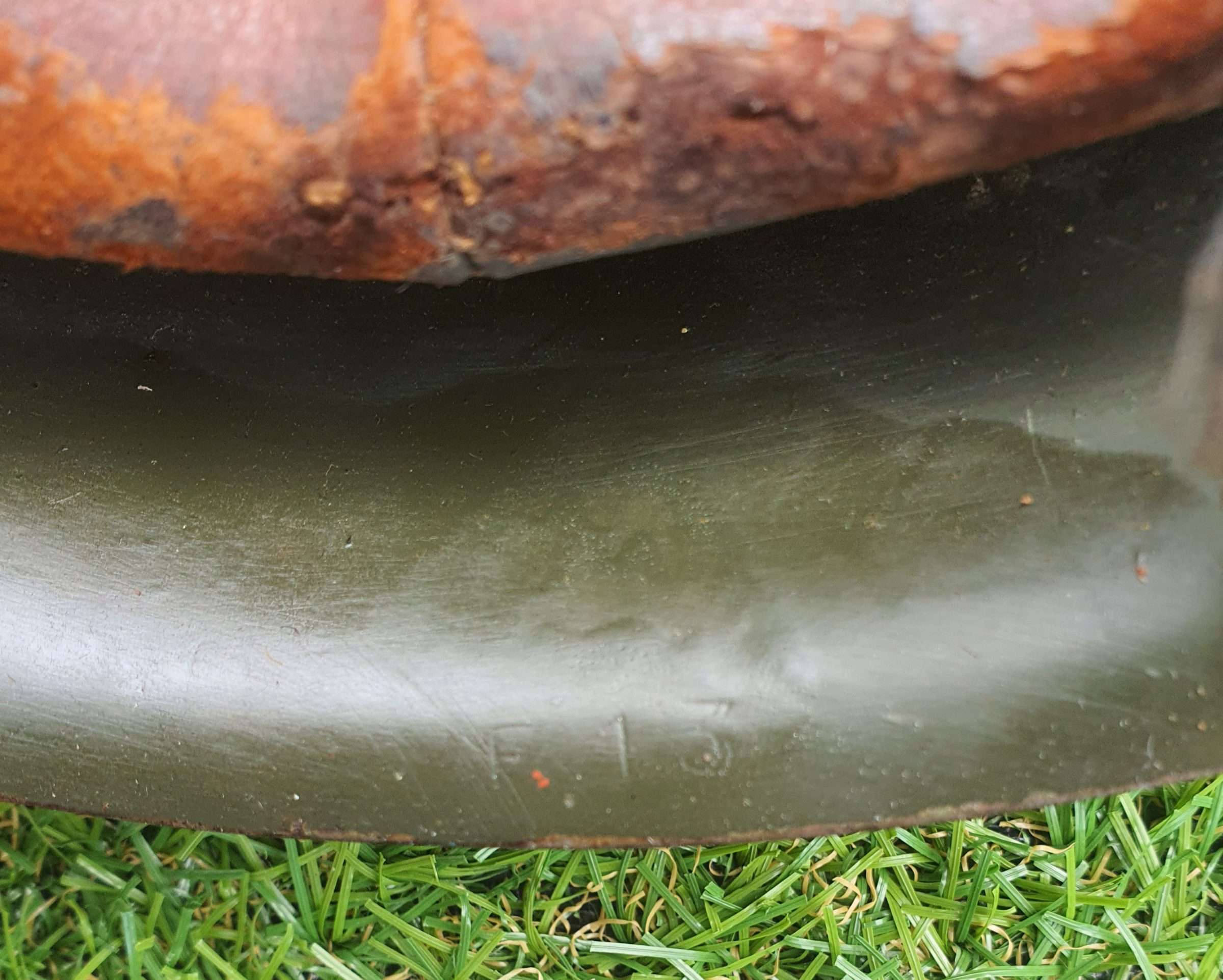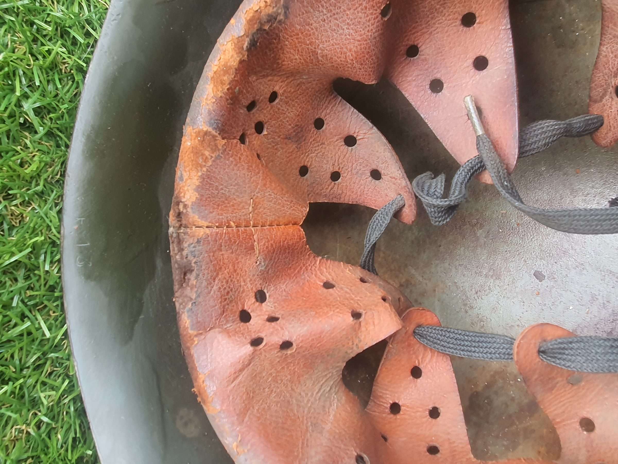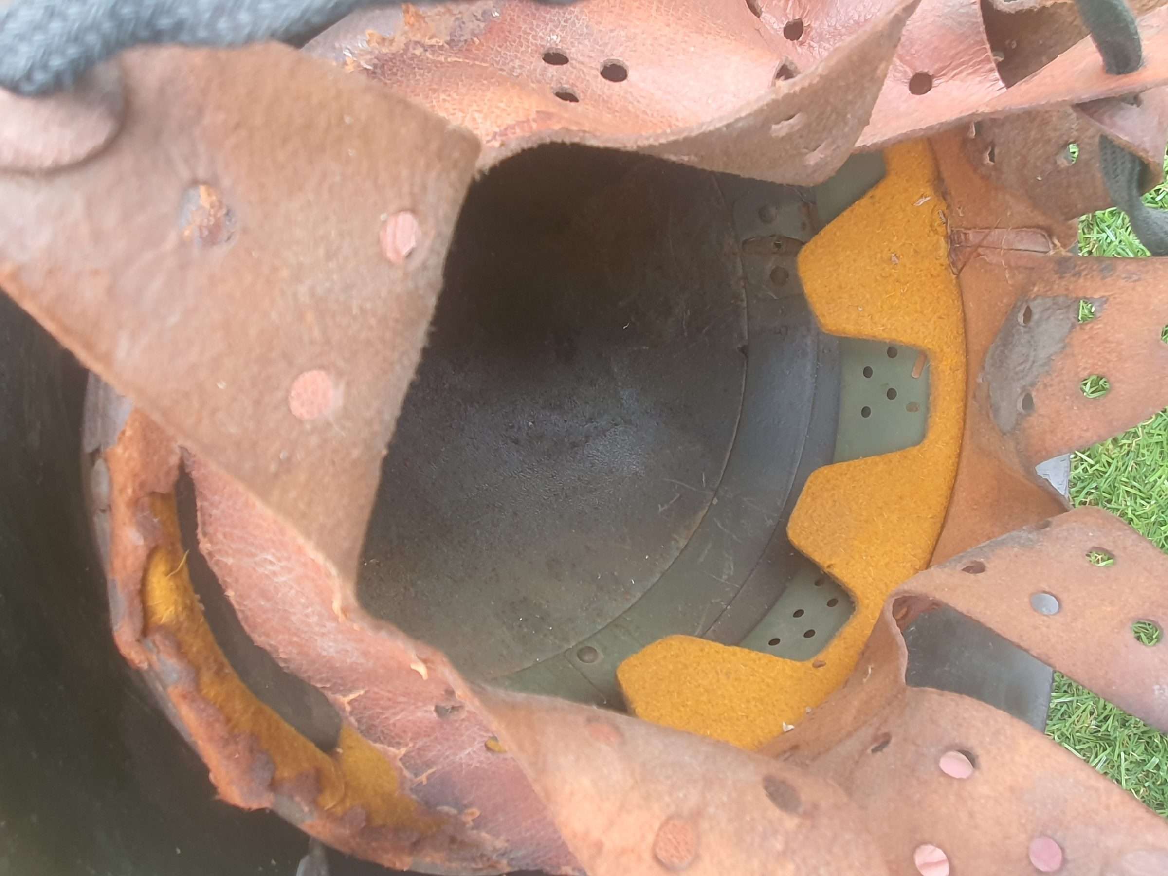 This is a WW2 Period helmet, and shows the original green paint of the Italian army on the outside shell, the inside has been resprayed but does have the original paint underneath. Not chin strap.